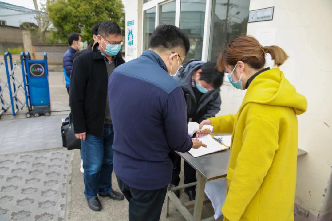 考察调研的领导在公司入口处进行体温检测、登记