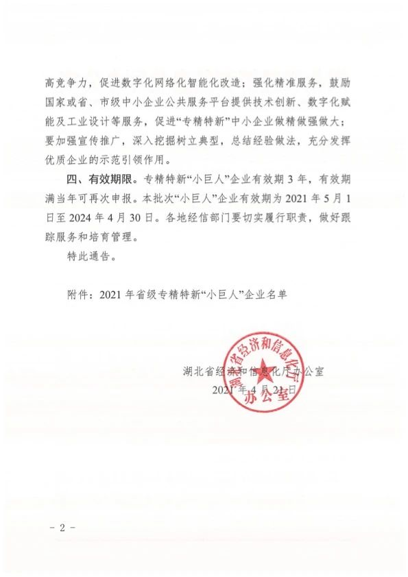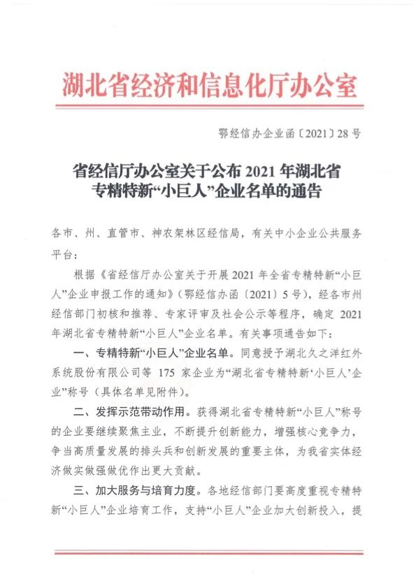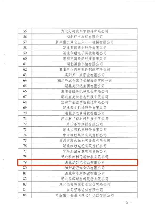 4 月 21 日,湖北省经济和信息化厅办公室发布《省经信厅办公室关于公布 2021 年湖北省专精特新“小巨人”企业名单的通告》,湖北远野风食品有限公司与其它 174 家企业共同入选。