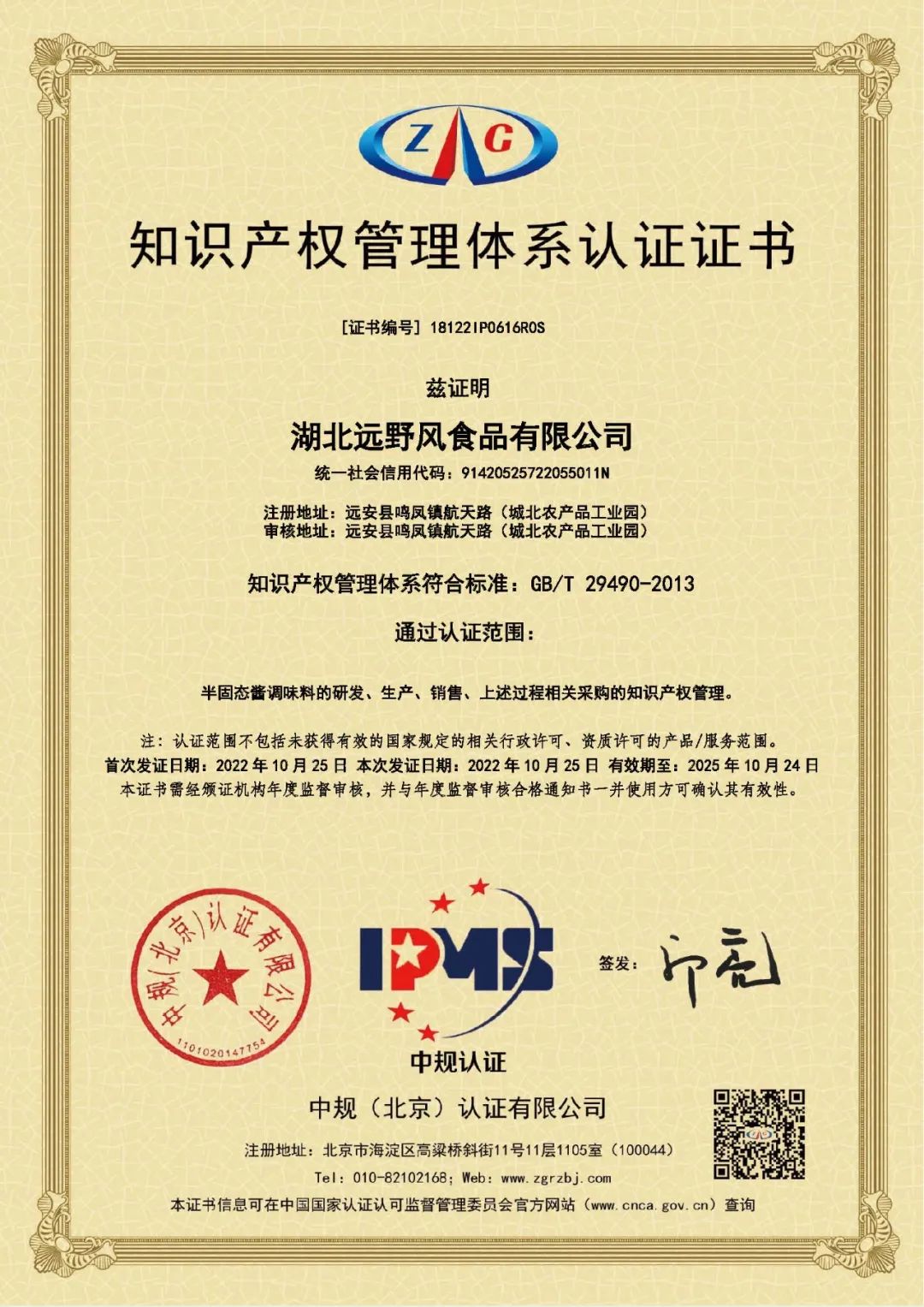 公司 ︱ 远野风食品通过企业知识产权管理体系认证