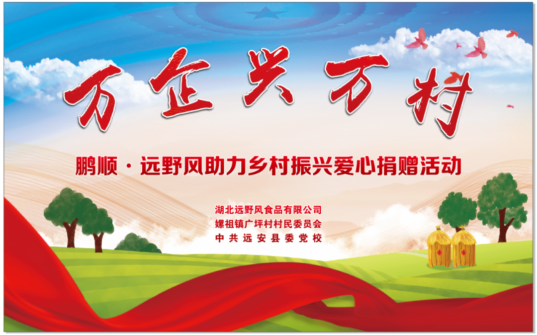 2 月 24 日,湖北远野风食品有限公司联合中共远安县委党校到嫘祖镇广坪村开展 “万企兴万村” 助力乡村振兴爱心捐赠活动。公司向本次活动捐赠价值 2 万元物资,惠及 100 户脱贫群众。县委党校常务副校长罗大刚,副校长王岩南、嫘祖镇党委副书记吴东云出席活动,公司总经理洪少锋、常务副总宋飞参加活动。